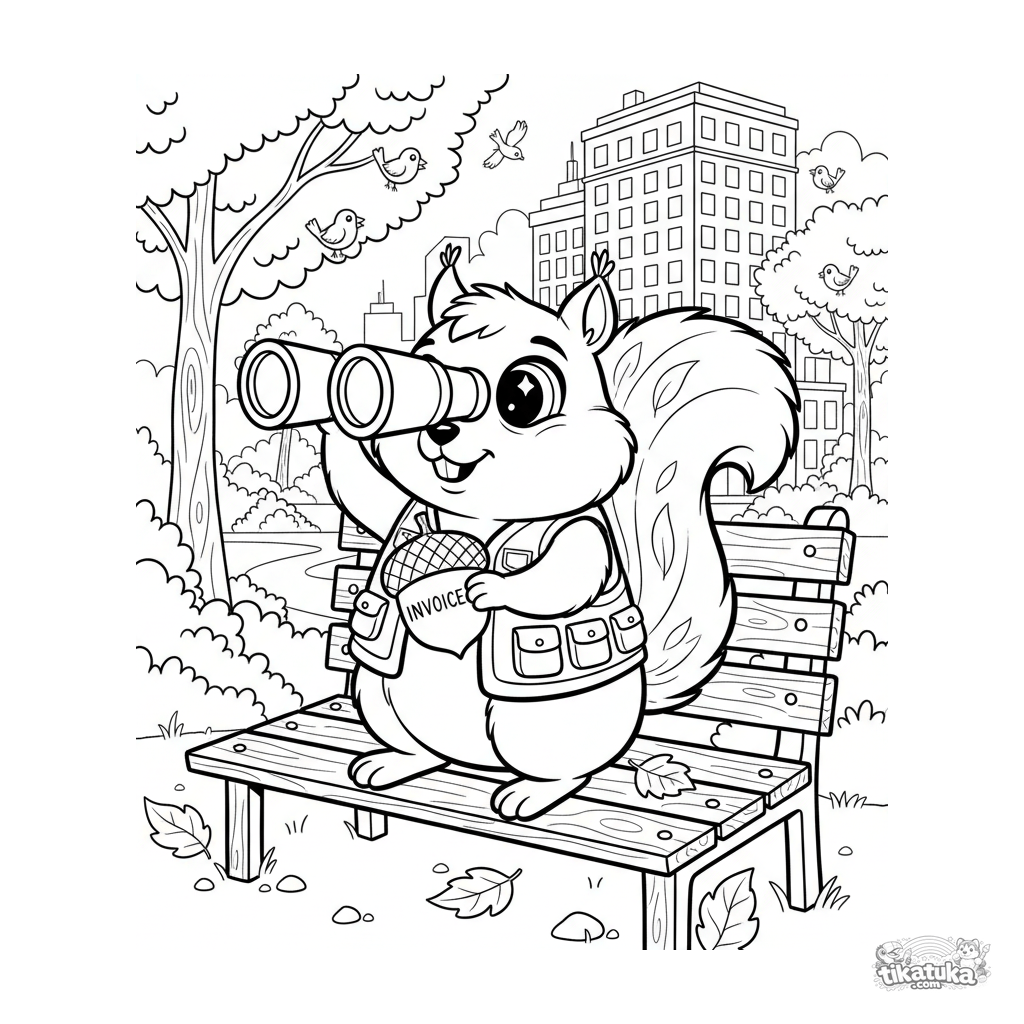 Ausmalbild für Kinder 10-12: Ein entschlossenes Eichhörnchen mit Weste und Fernglas auf einer Parkbank sucht seinen Zahltag. Lustige, detaillierte Szene.