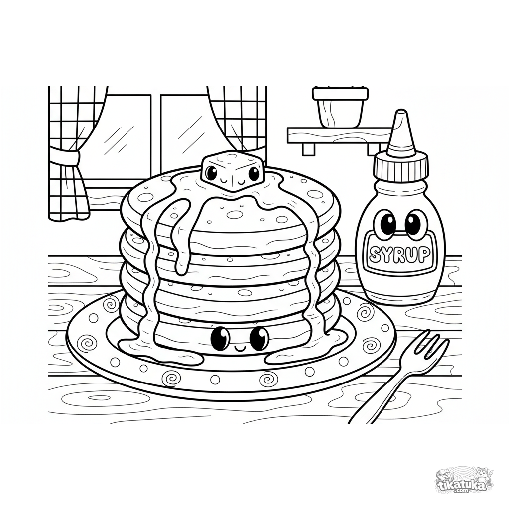 Essen-Ausmalbild für Kinder von 4-6 Jahren. Ein hoher Stapel fluffiger Pfannkuchen mit Sirup und schmelzender Butter auf einem gemütlichen Küchentisch.