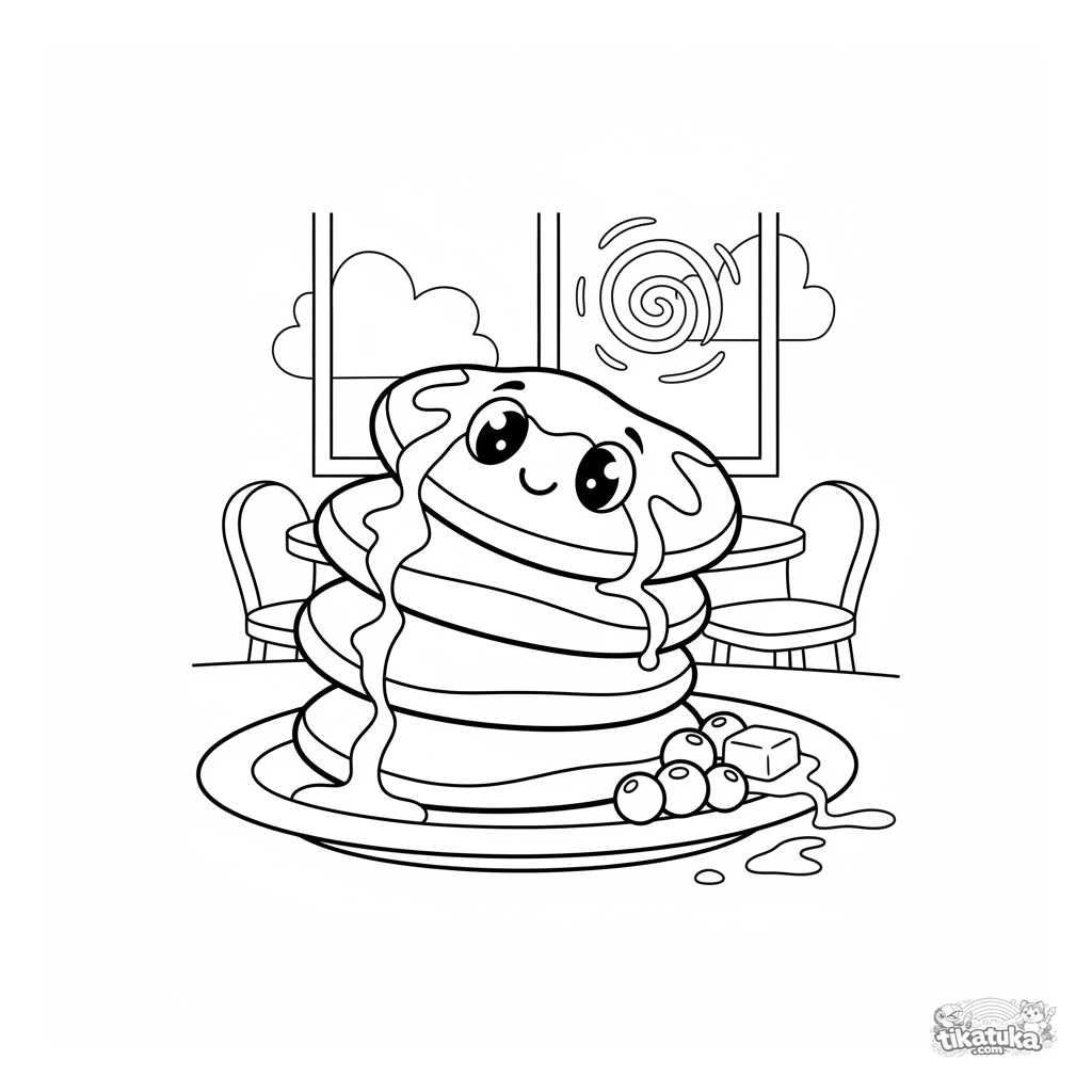 Ausmalbild eines Pfannkuchenstapels für Kinder von 4-6 Jahren. Der oberste Pfannkuchen hat ein Sirup-Lächeln, mit Beeren und Butter in der Nähe. Eine lustige und einfache Szene zum Ausmalen.