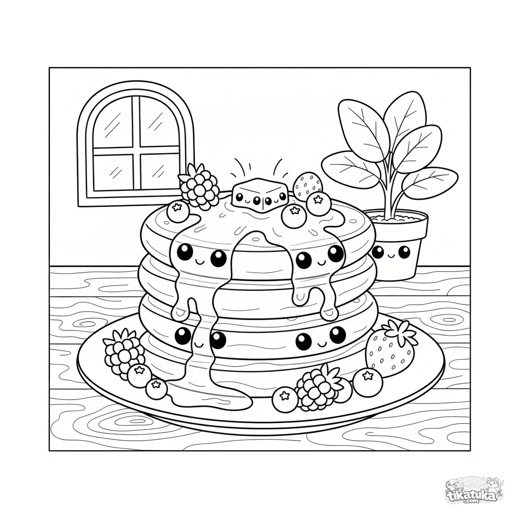 Ausmalbild für Kinder 4-6: ein leckerer Pfannkuchenstapel mit Beeren und Ahornsirup. Eine lustige, einfache Essensszene zum Ausmalen.