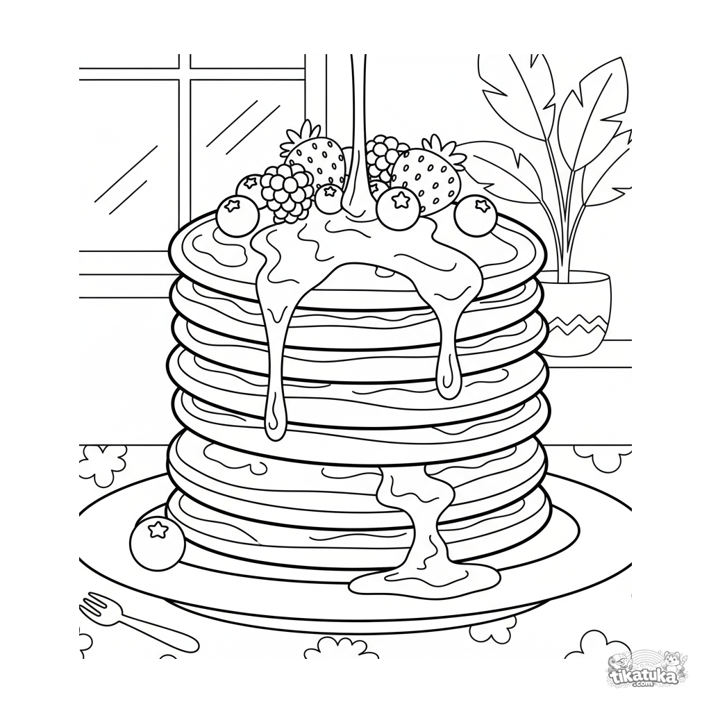 Ausmalbild eines Stapels leckerer Pfannkuchen mit Beeren und Sirup. Für Kinder von 4-6 Jahren. Lustige, einfache Szene.