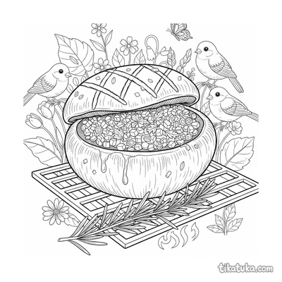 Ein Ausmalbild zum Thema Essen mit Detailgrad Mittel. Es passt für das Alter 4-6 Jahre, lässt sich gut zu Hause drucken und sofort online öffnen.