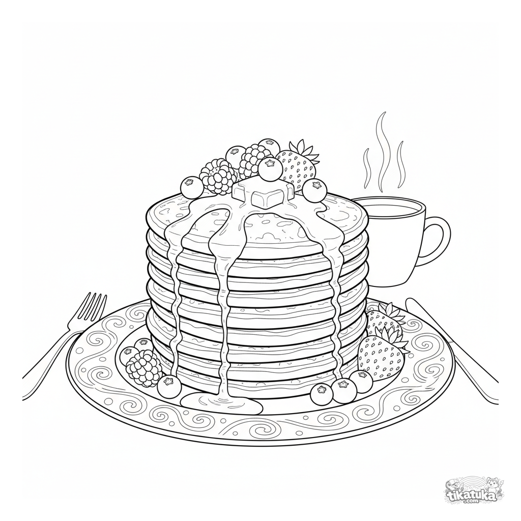 Ausmalbild von leckerem Essen für Kinder von 4-6 Jahren. Ein hoher Stapel Pfannkuchen mit tropfendem Sirup, Beeren und einem Stück Butter.
