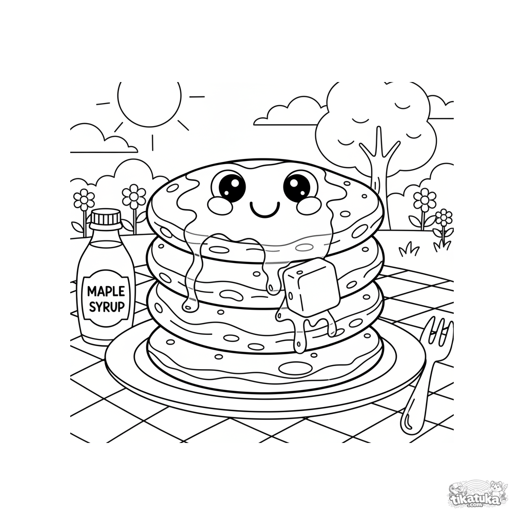 Ausmalbild für Kinder 4-6: Ein hoher Stapel lächelnder Pfannkuchen mit einem Beerengesicht auf einem Teller auf einer Picknickdecke in einem sonnigen Garten.