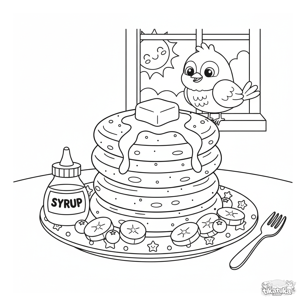 Ausmalbild von Essen für Kinder von 4-6 Jahren. Zeigt einen hohen Stapel fluffiger Pfannkuchen mit schmelzender Butter und Früchten auf einem Teller.