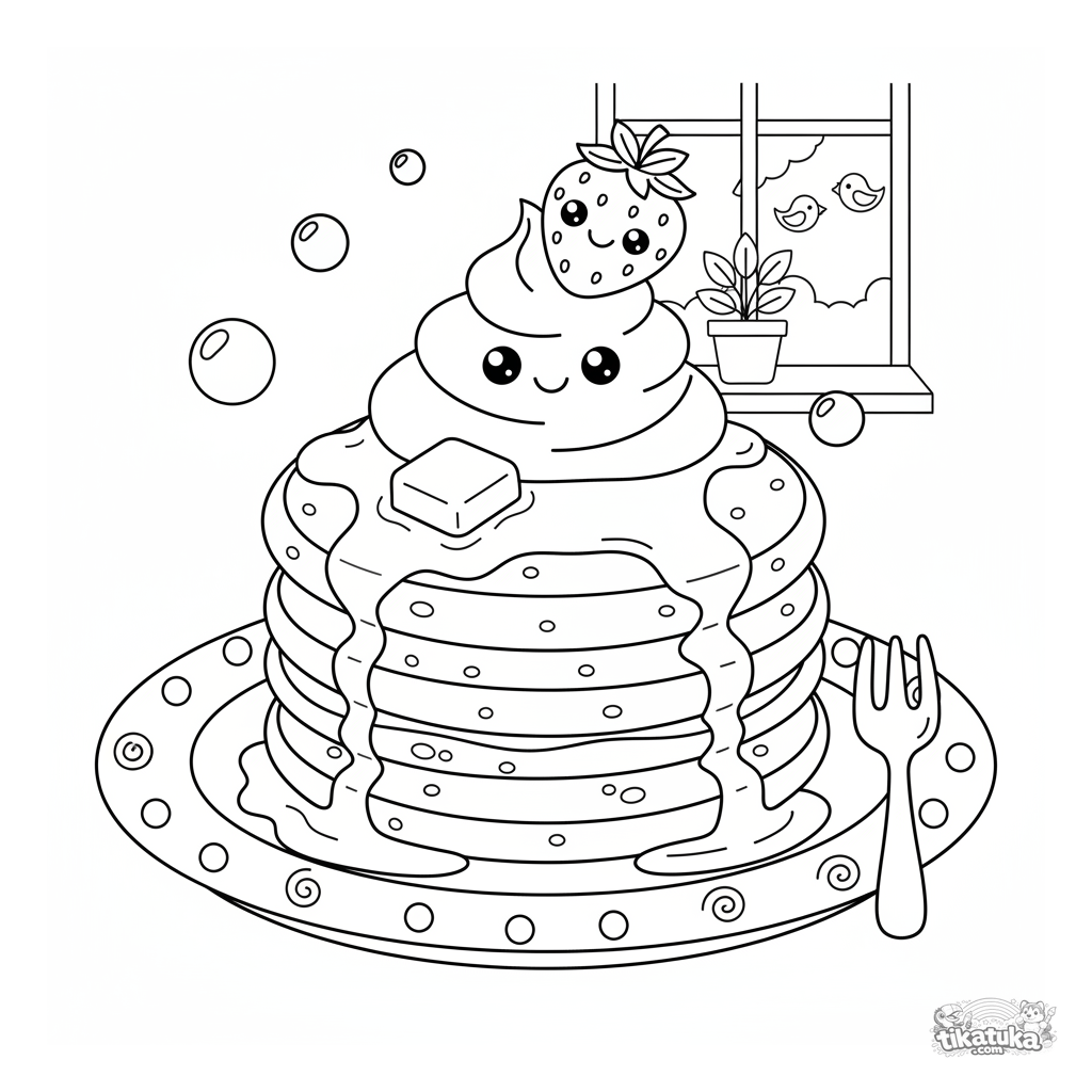 Ausmalbild eines leckeren Stapels Pfannkuchen. Für Kinder von 4-6 Jahren. Fluffige Pfannkuchen mit Sirup, Schlagsahne und einer lächelnden Erdbeere auf einem Teller.