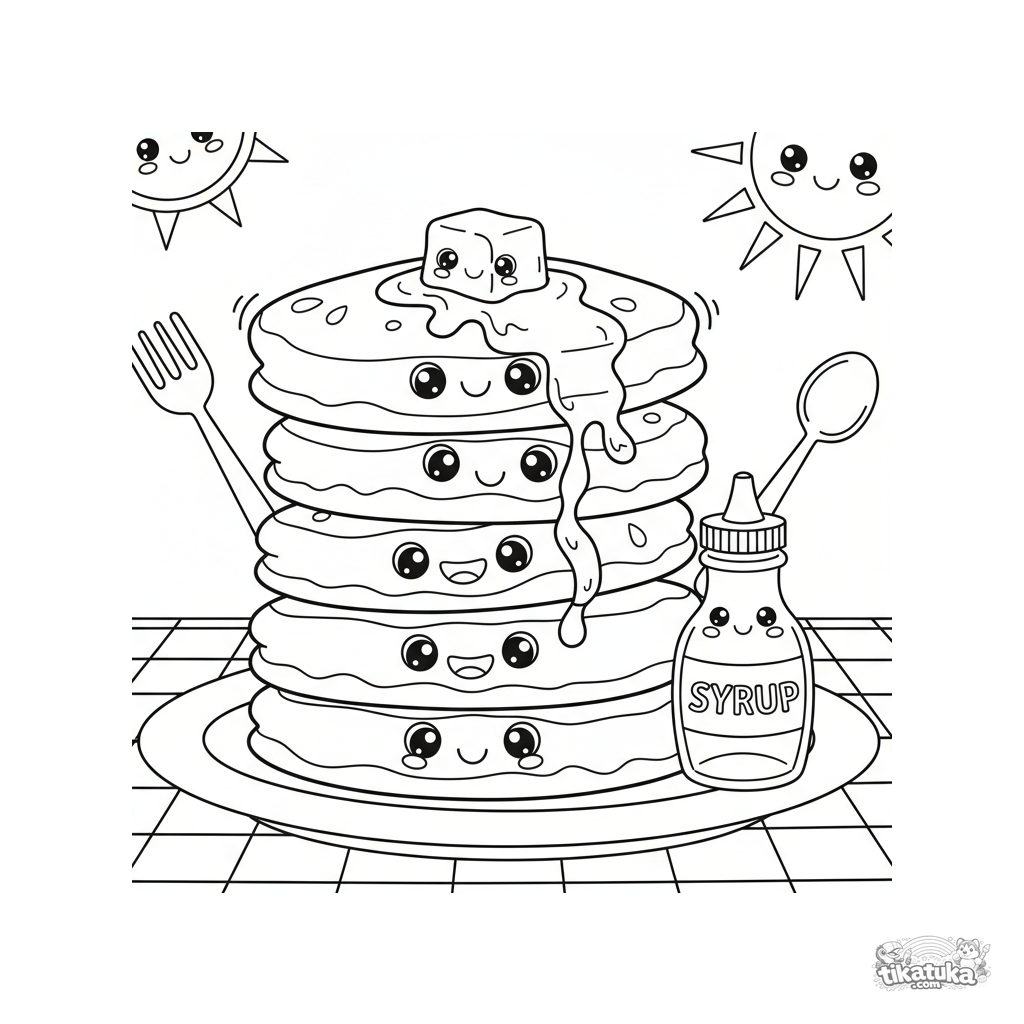 Ausmalbild für Kinder: Ein hoher Stapel lächelnder Pfannkuchen mit schmelzender Butter. Eine lustige, appetitliche Szene mit mittlerem Detaillierungsgrad.