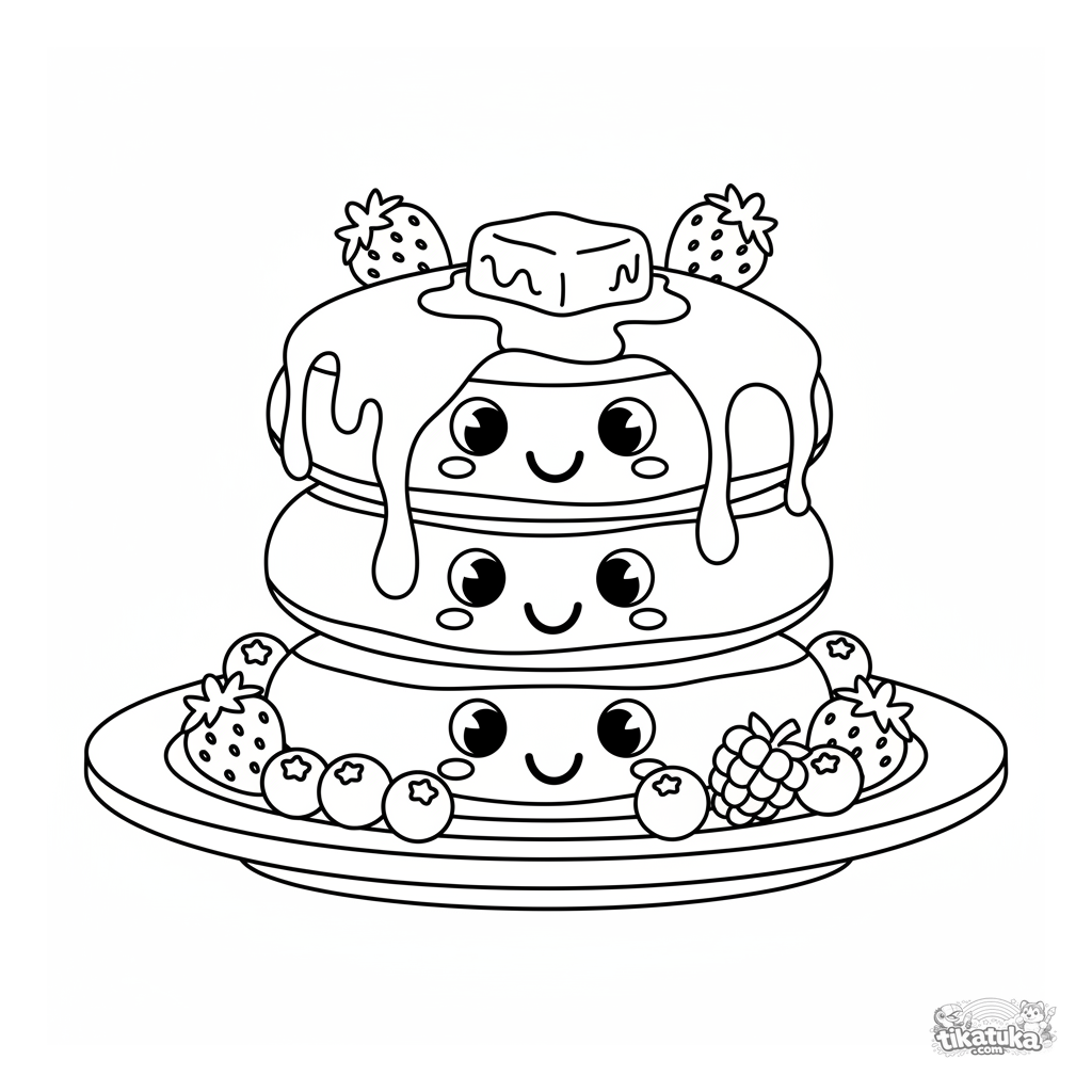 Ausmalbild für Kleinkinder: ein fröhlicher Stapel lächelnder Pfannkuchen mit Sirup und Beeren. Sehr einfache, große, geschlossene Formen für die ersten Stifte.