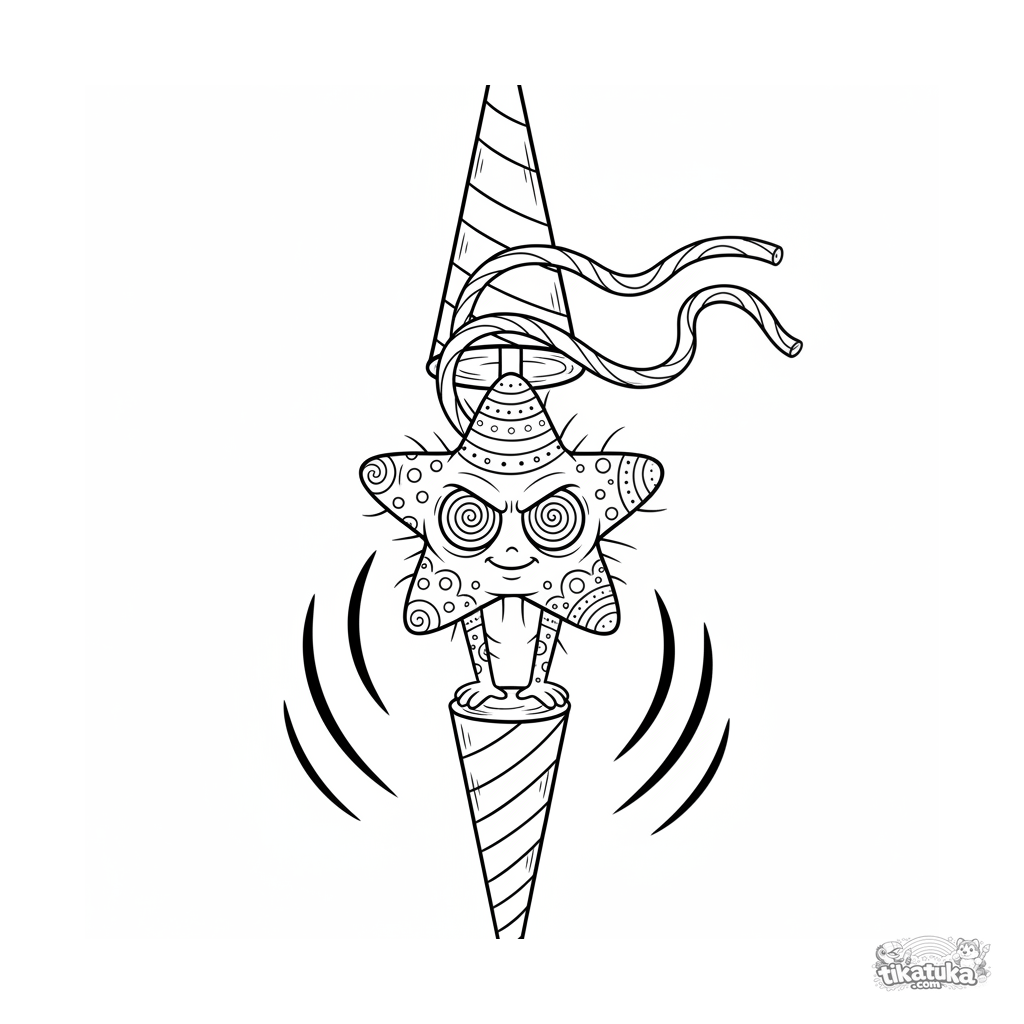 Detailliertes Ausmalbild für ältere Kinder 10-12: eine Stern-Mikrobe turnt einen Handstand auf der Lutscherspitze. Dynamischer Comic-Stil, Action-Linien.