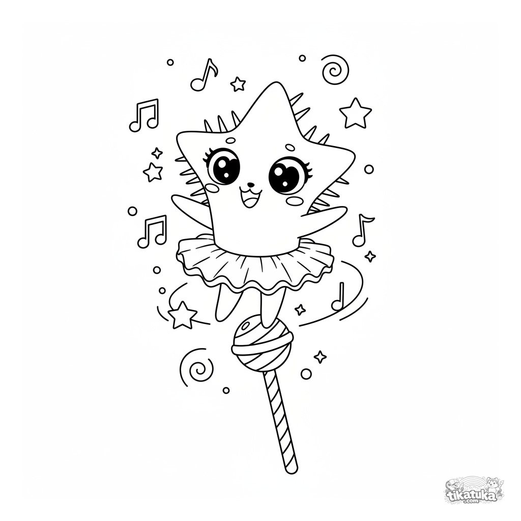 Ausmalbild für Kinder 7-9: Eine sternförmige Mikrobe tanzt auf der Spitze eines Lollipops. Leichte, anmutige Szene mit Noten und Glitzer.