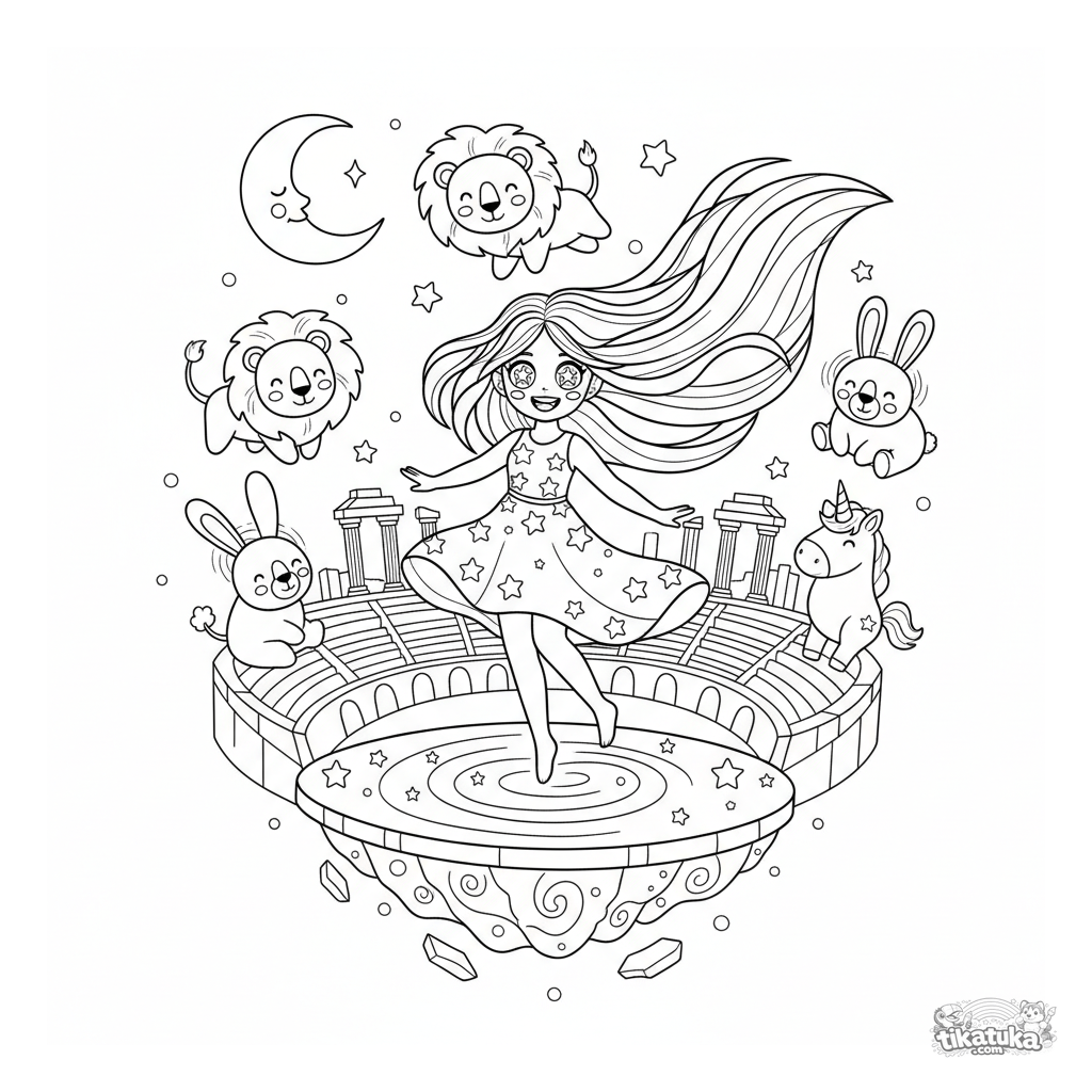 Ausmalbild für Kinder 5-9: Eine fröhliche Sternennymphe tanzt am Nachthimmel über einem antiken Amphitheater. Magische Sternbilder und luftige Formen zum Ausmalen.
