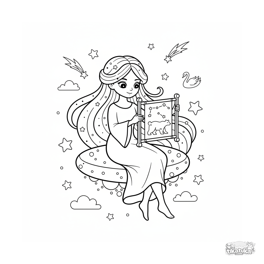 Ausmalbild für Tweens 7-9: eine anmutige Sternennymphe webt auf einer schwebenden Plattform ein leuchtendes Netz aus Sternenlichtfäden zu Sternbildern.