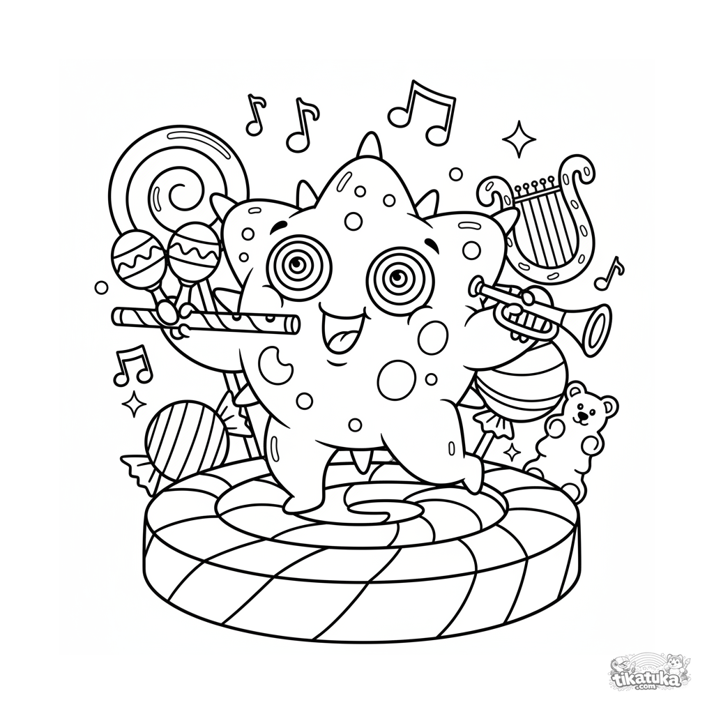 Ausmalbild für Kinder 7-9 Jahre: Ein sternförmiger Mikroben-Musiker gibt ein lustiges Konzert auf einer Lollipop-Oberfläche und spielt Süßigkeiteninstrumente. Heller Pop-Art-Sticker-Stil.