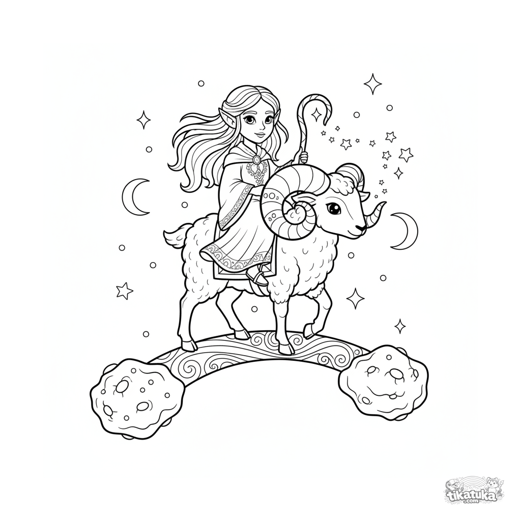 Ausmalbild für 7-9 Jahre: Ein elfischer Sternenhirte reitet auf einem Mondwidder über eine Sternenlichtbrücke. Schöne Fantasieszene im Weltraum.