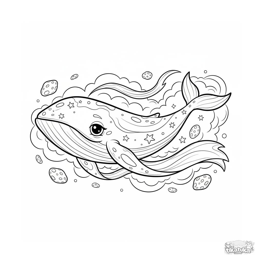 Ausmalbild für 7-9 Jahre: Ein riesiger Sternenwal schwimmt durch einen farbenfrohen Nebel. Eine Aquarell-Skizzen-Stil-Szene zum kreativen Ausmalen.