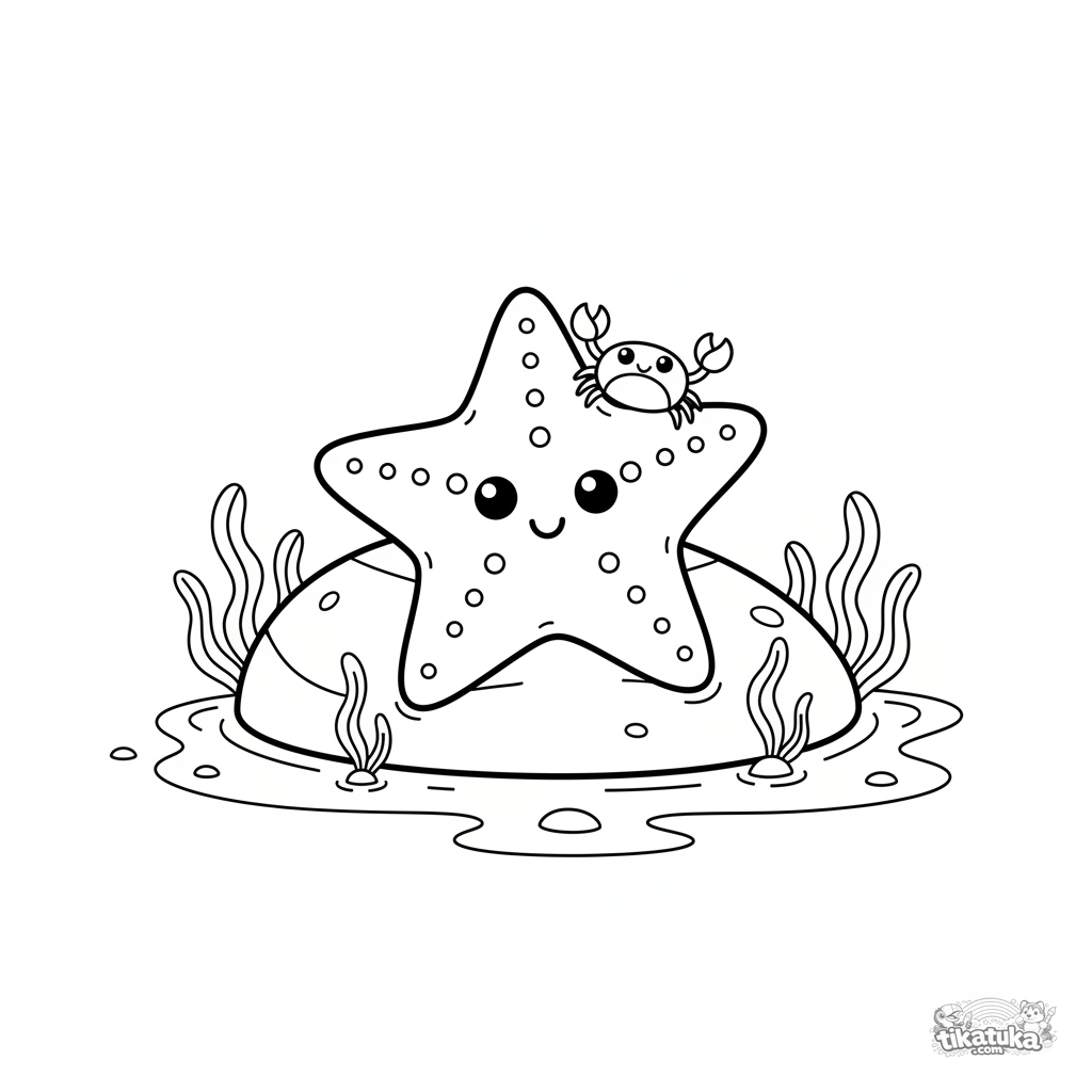 Sehr einfaches Kleinkind-Ausmalbild für 2-3 Jahre: Ein Seestern und ein kleiner Krebs auf einem Felsen. Sehr große Figuren, minimale Details.