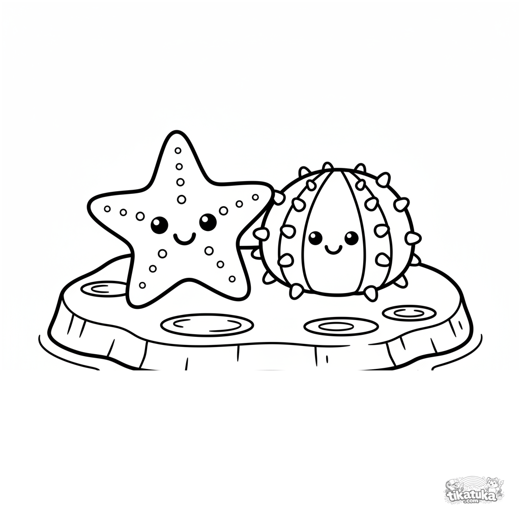 Einfaches Ausmalbild für Kleinkinder: Ein Seestern und ein Seeigel sitzen auf einem Stein in einem sonnigen Gezeitentümpel. Für 2-3 Jahre. Geometrische Formen wie Holzspielzeug.