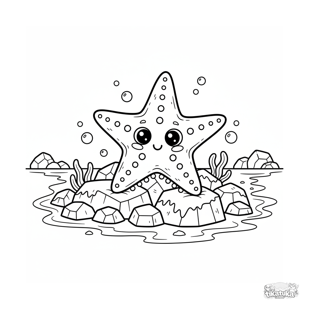 Ausmalbild eines Seesterns, der langsam über warme Steine in einem sonnigen Gezeitentümpel kriecht. Für 4-6 Jahre. Klare Silhouetten, Paper-Cut-Stil.