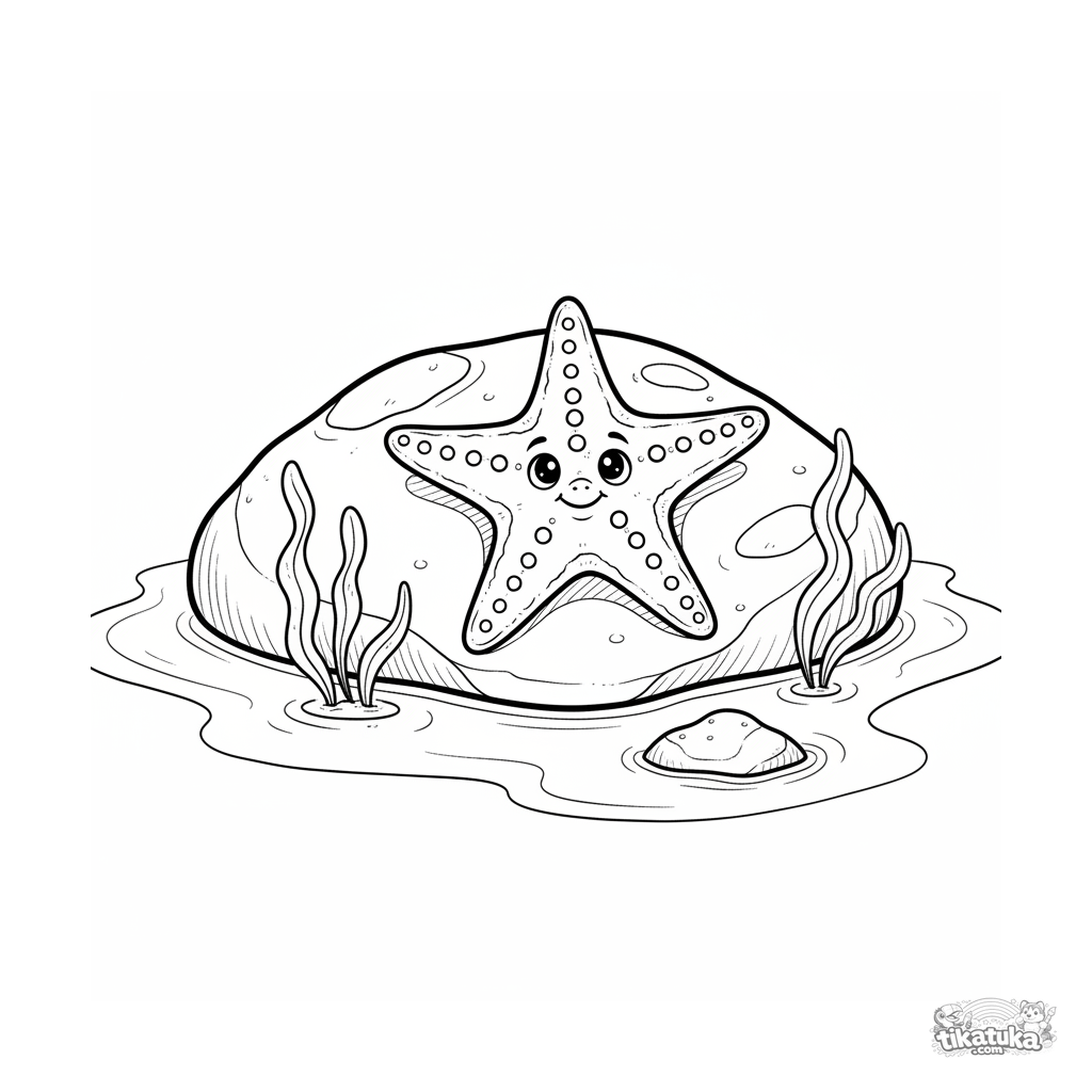 Ausmalbild eines Seesterns, der auf einem Felsen in einem sonnigen Gezeitentümpel ruht. Für Kinder von 7-9 Jahren.