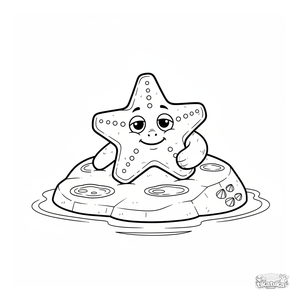 Ausmalbild eines kuscheligen Seesterns, der sich auf einem sonnengewärmten Felsen im flachen Gezeitentümpel ausruht. Für Kinder von 4-6 Jahren.