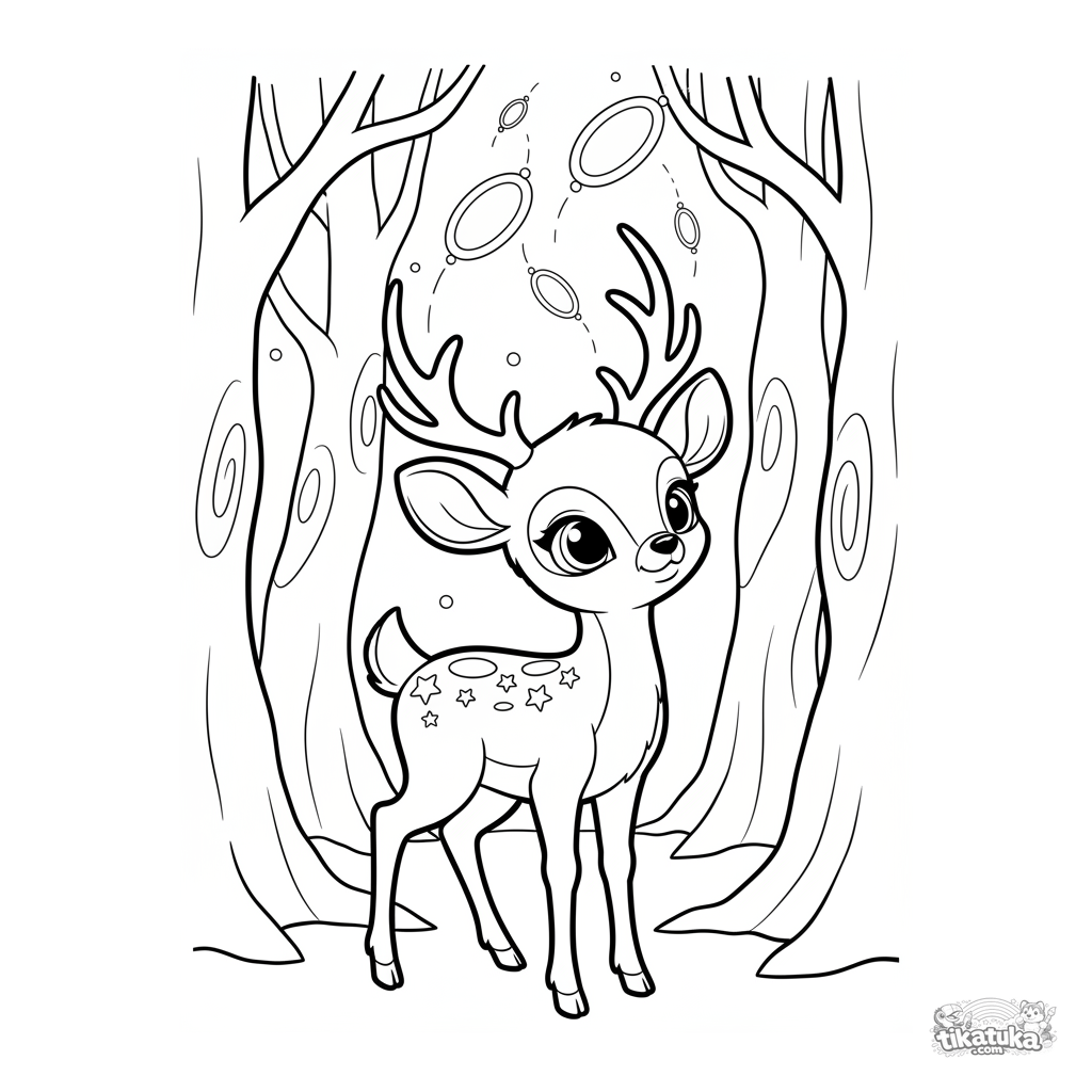Einfaches Ausmalbild für Kleinkinder 2-3: ein magisches Kitz mit sternenbesetztem Fell steht auf einer Lichtung im uralten Wald. Große Umrisse, wenige Details.