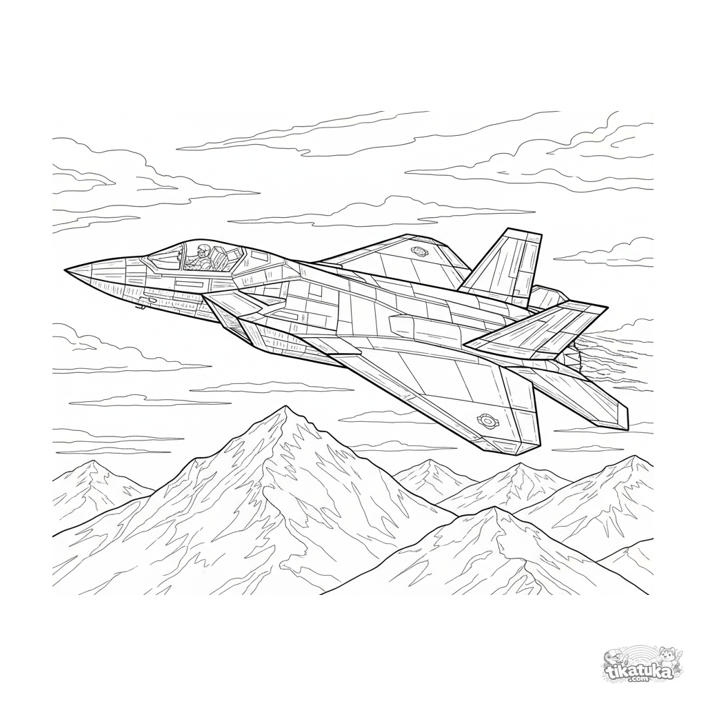 Schwieriges, realistisches Ausmalbild für Jungen: Ein Tarnkappenjäger fliegt eine Kurve über schneebedeckte Berggipfel bei Sonnenuntergang. Hohe Detailliertheit.