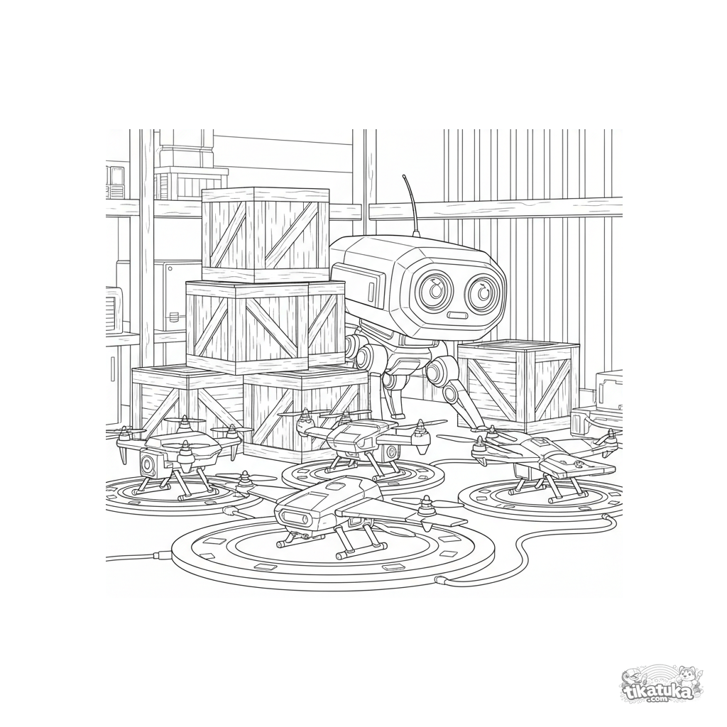 Detailliertes Ausmalbild für 10-12 Jahre: ein heimlicher sechseckiger Überwachungsroboter beobachtet Drohnen hinter einem Stapel Holzkisten in einer dunklen Lagerhausecke. Detaillierte Kameras und Antennen.