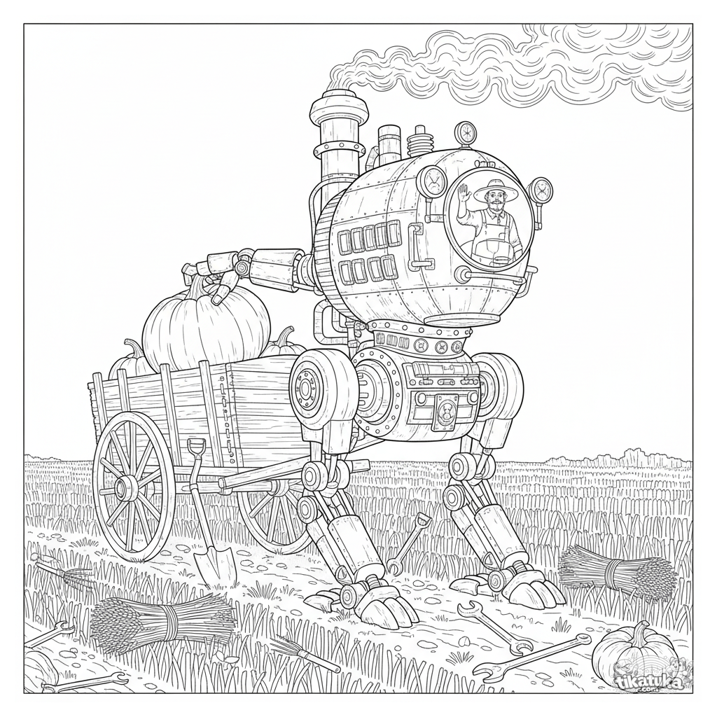 Detailliertes realistisches Ausmalbild: Ein dampfbetriebener Farmroboter erntet einen Riesenkürbis auf einem Feld. Für Kinder von 8-12 Jahren. Details enthalten genietete Platten, ein Glas-Cockpit und einen Holzkarren.