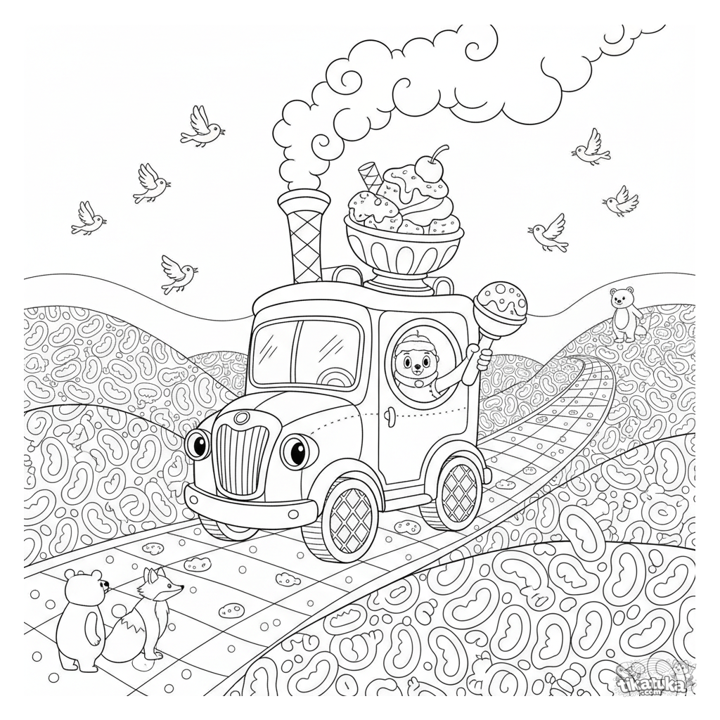 Ausmalbild für Jungen: Ein dampfbetriebener Eiswagen mit Waffelhörnchen-Rädern fährt durch Gummibärchen-Hügel. Für Kinder von 6 bis 9 Jahren.