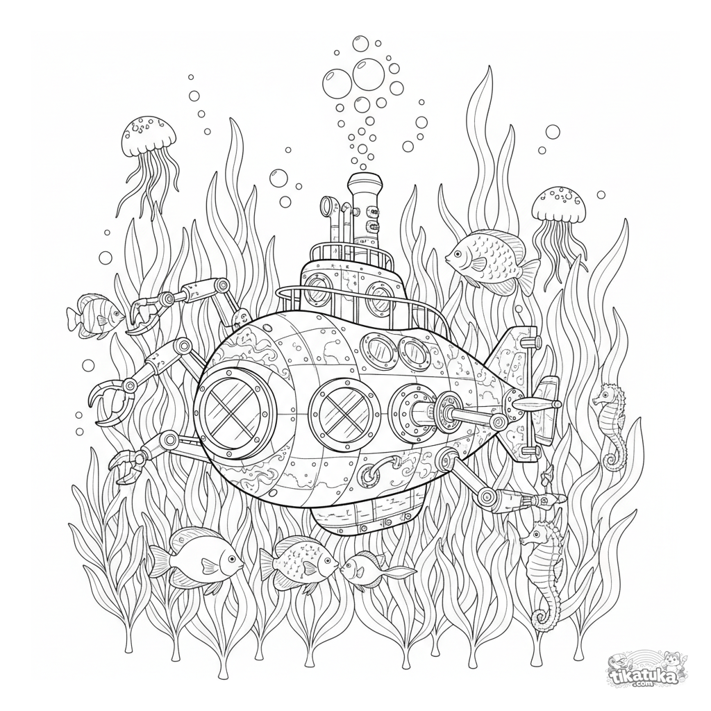 Realistisches Ausmalbild eines detaillierten viktorianischen, dampfbetriebenen U-Boot-Explorers in einem Tangwald. Für Kinder von 6-9 Jahren.