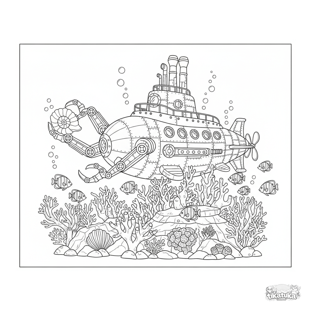 Ausmalbild eines detaillierten, dampfbetriebenen U-Boots, das ein Korallenriff erkundet. Für Kinder ab 8 Jahren. Anspruchsvolles Niveau.