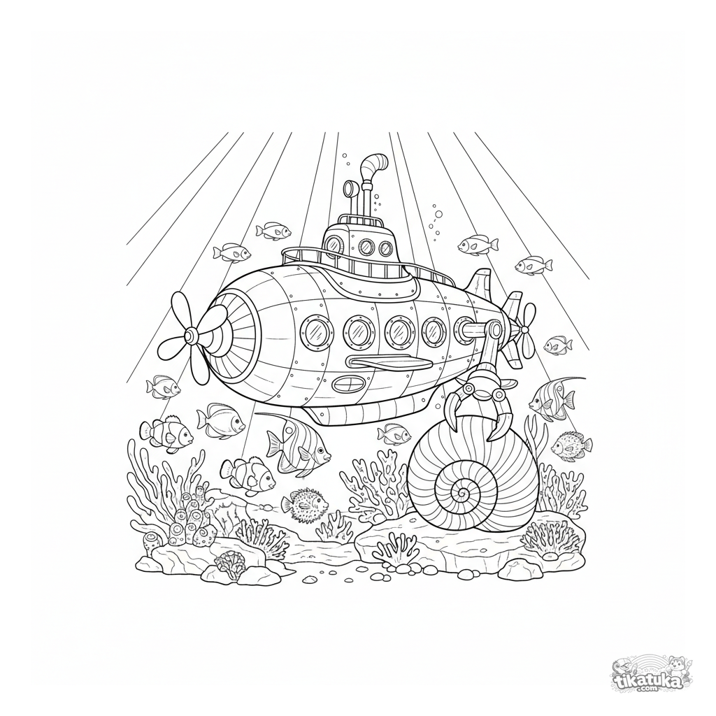 Ausmalbild eines detaillierten dampfbetriebenen U-Boots, das mit einem mechanischen Arm ein farbenfrohes Korallenriff erkundet. Für Kinder von 8 bis 12 Jahren.