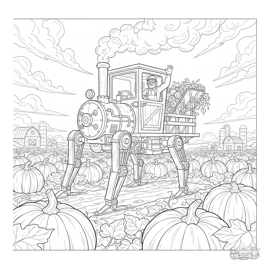 Schwieriges Ausmalbild für Kinder 8-12: Ein fantastischer dampfbetriebener Traktor mit Kolbenbeinen erntet riesige Kürbisse auf einem Feld, gefahren von einem Ingenieur mit Schutzbrille, der aus der Kabine winkt.