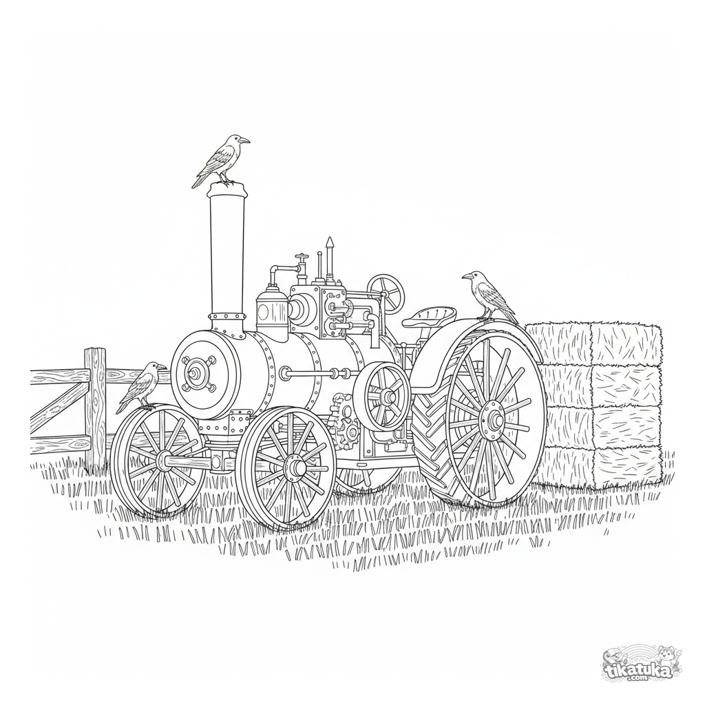 Schwieriges Ausmalbild eines detaillierten dampfbetriebenen Traktors auf einem Heufeld. Für Kinder von 8-12 Jahren. Enthält Holzräder, Heuballen und Krähen. Volles Fahrzeug, breite Ränder.