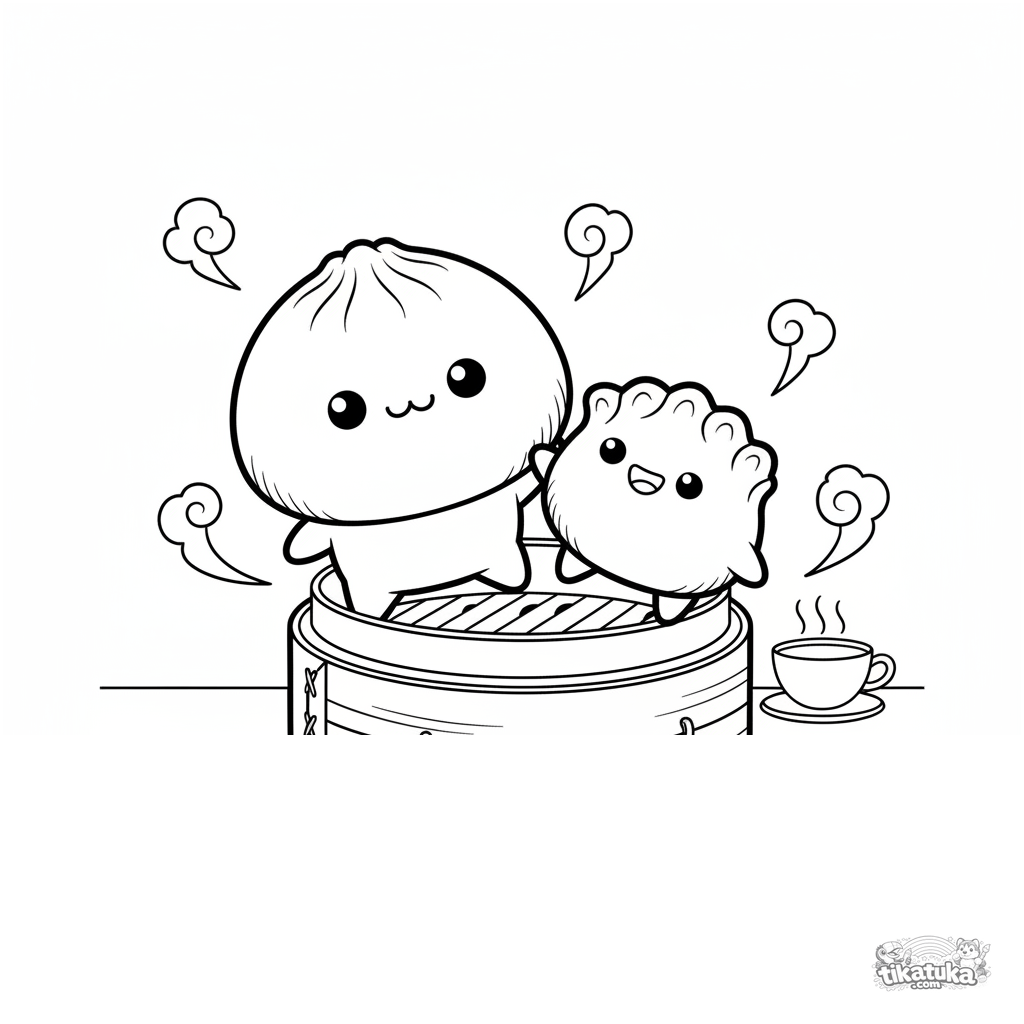 Ausmalbild: Ein Dampfbrötchen und ein Dumpling helfen sich gegenseitig, auf einem Bambus-Dämpfer in einem Café zu balancieren. Niedliche Szene mit Dampf. Für 4-6 Jahre.
