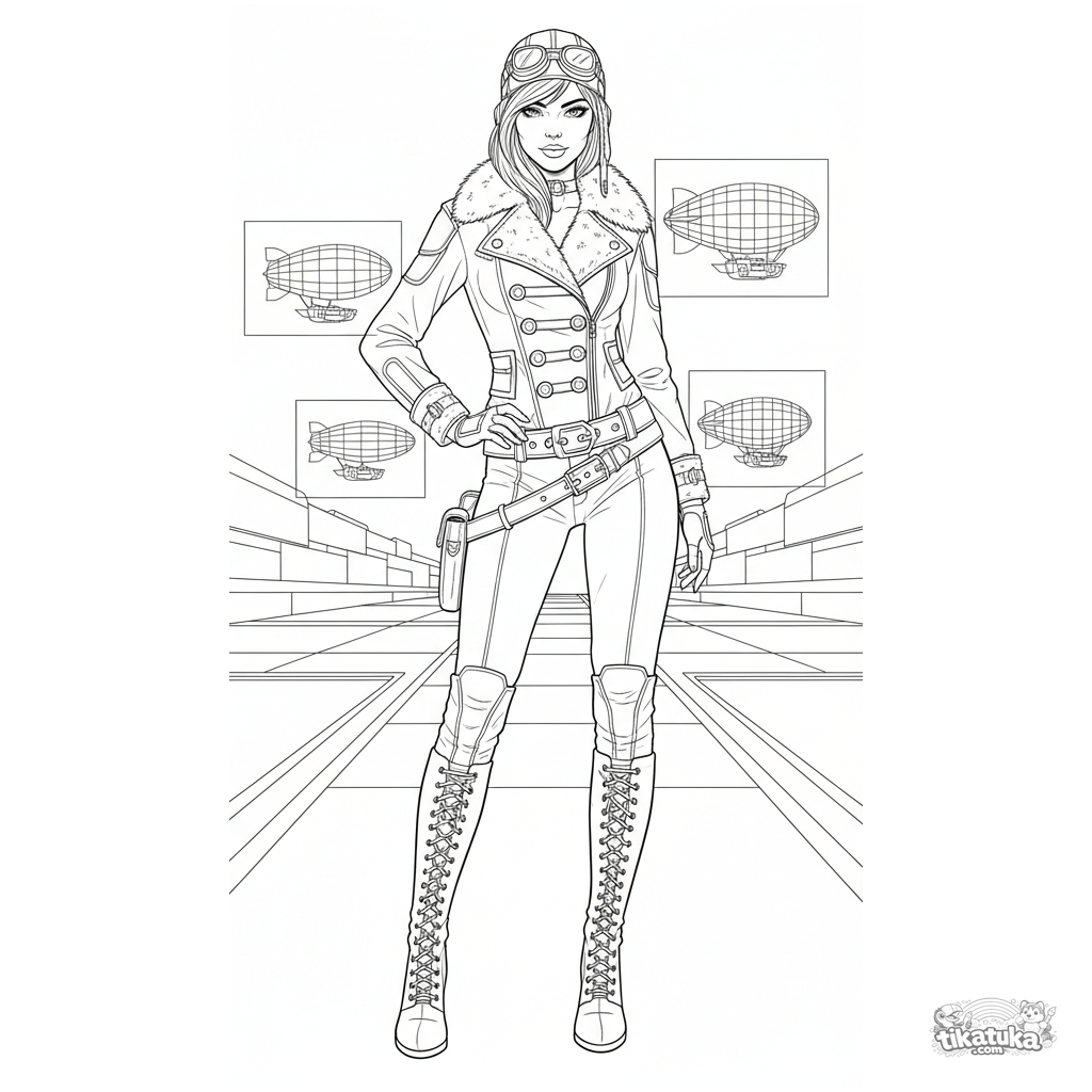 Komplexes Ausmalbild für 10-12 Jahre: Ein Model in einer Steampunk-Fliegerjacke auf einem futuristischen Laufsteg. Detaillierte mechanische Elemente, Accessoires und holografischer Hintergrund.