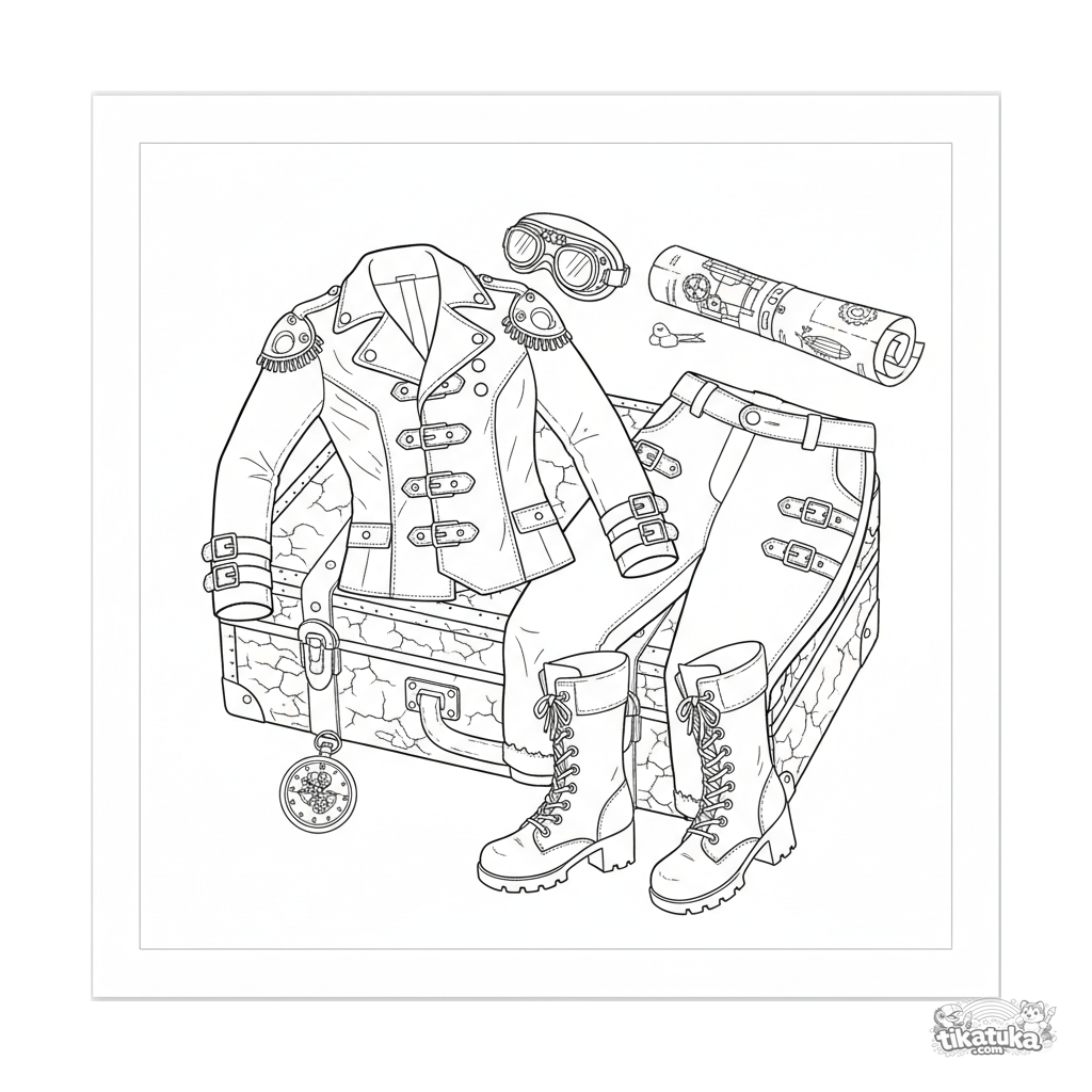 Komplexes Ausmalbild für 10-12 Jahre: Ein detailliertes Steampunk-Fliegeroutfit liegt flach auf einem Koffer. Enthält Lederjacke, Reithose, Brille, Blaupause und antike Werkzeuge.