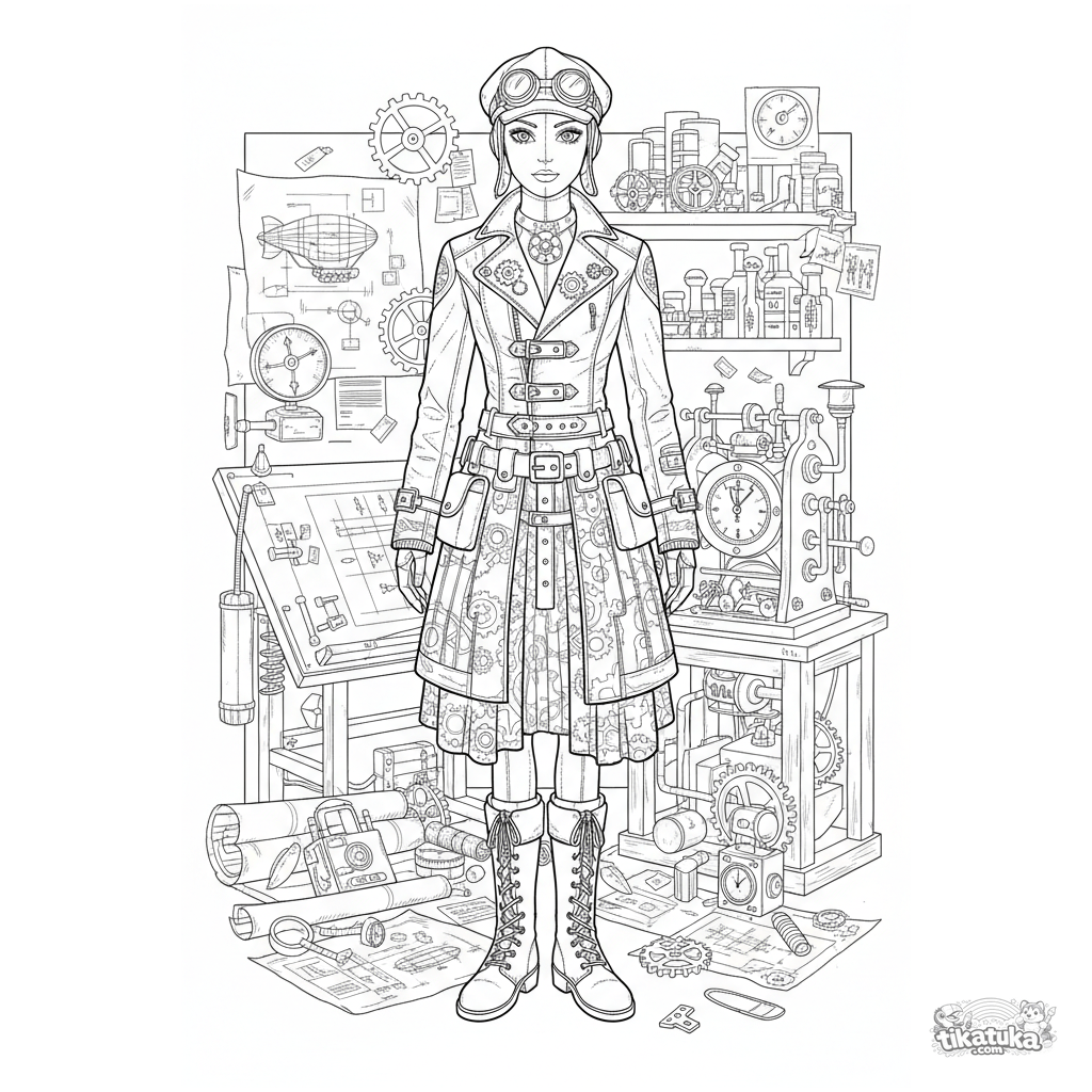 Komplexes Ausmalbild für 10-12 Jahre: Ein Steampunk-Aviator-Outfit an einer Schneiderpuppe in einer detaillierten Werkstatt mit Werkzeugen und Accessoires.