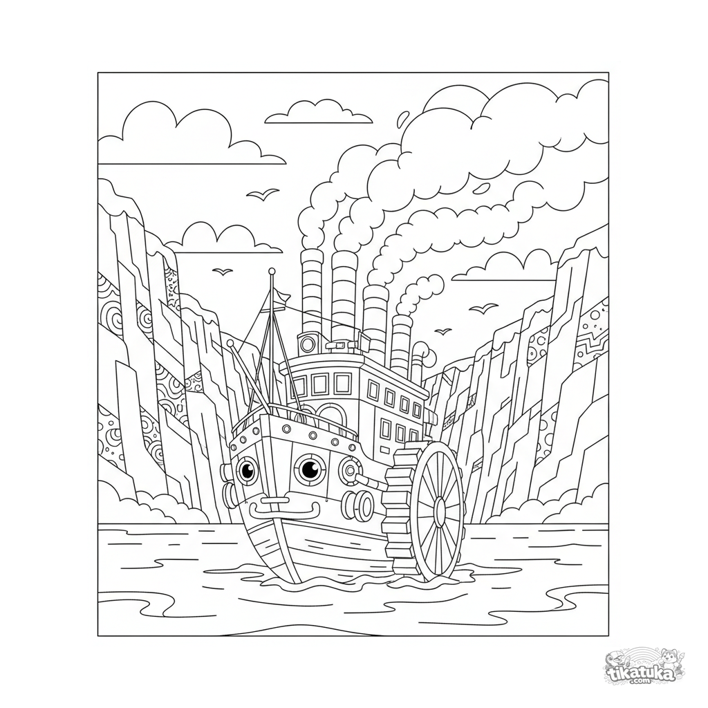 Kompliziertes Fantasy-Ausmalbild für ältere Kinder 10-12: Ein Steampunk-Raddampfer erkundet einen Fjord. Viele mechanische Details und eine raue Landschaft.