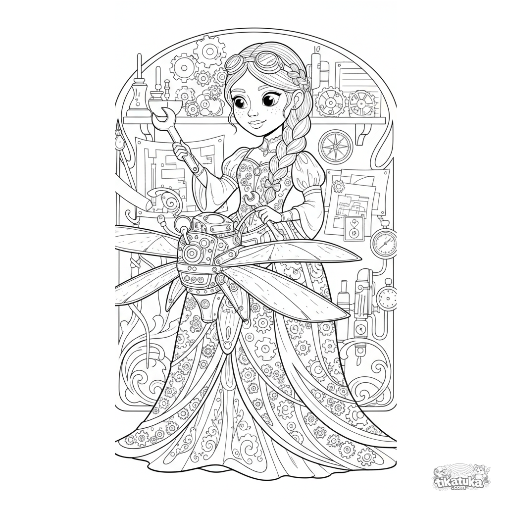 Ausmalbild für 10-12 Jahre: Eine Steampunk-Prinzessin erfindet eine Flugmaschine in ihrer unordentlichen Werkstatt voller Blaupausen und Messingwerkzeugen.