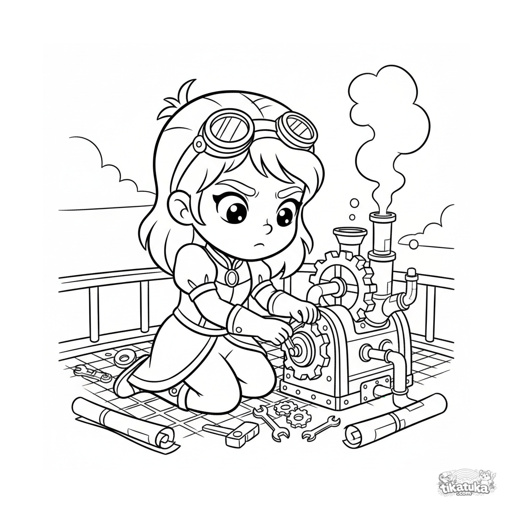 Ausmalbild für Kinder 4-6: Eine Steampunk-Prinzessin repariert einen Luftschiffmotor in den Wolken. Klare Formen und interessante Details.