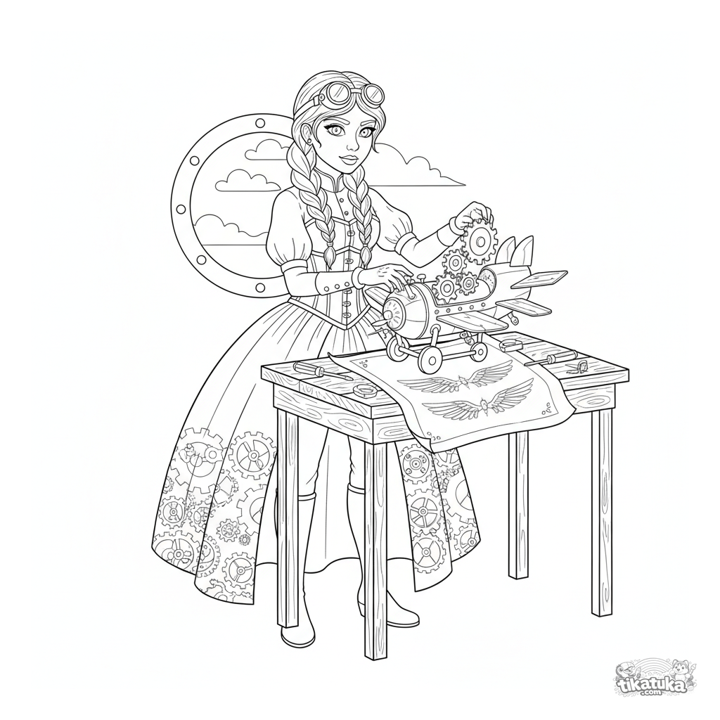 Ausmalbild für ältere Kinder 10-12: Eine Steampunk-Prinzessin bastelt an einer Flugmaschine in ihrer Werkstatt in den Wolken. Detaillierte Blaupausen und Werkzeuge.