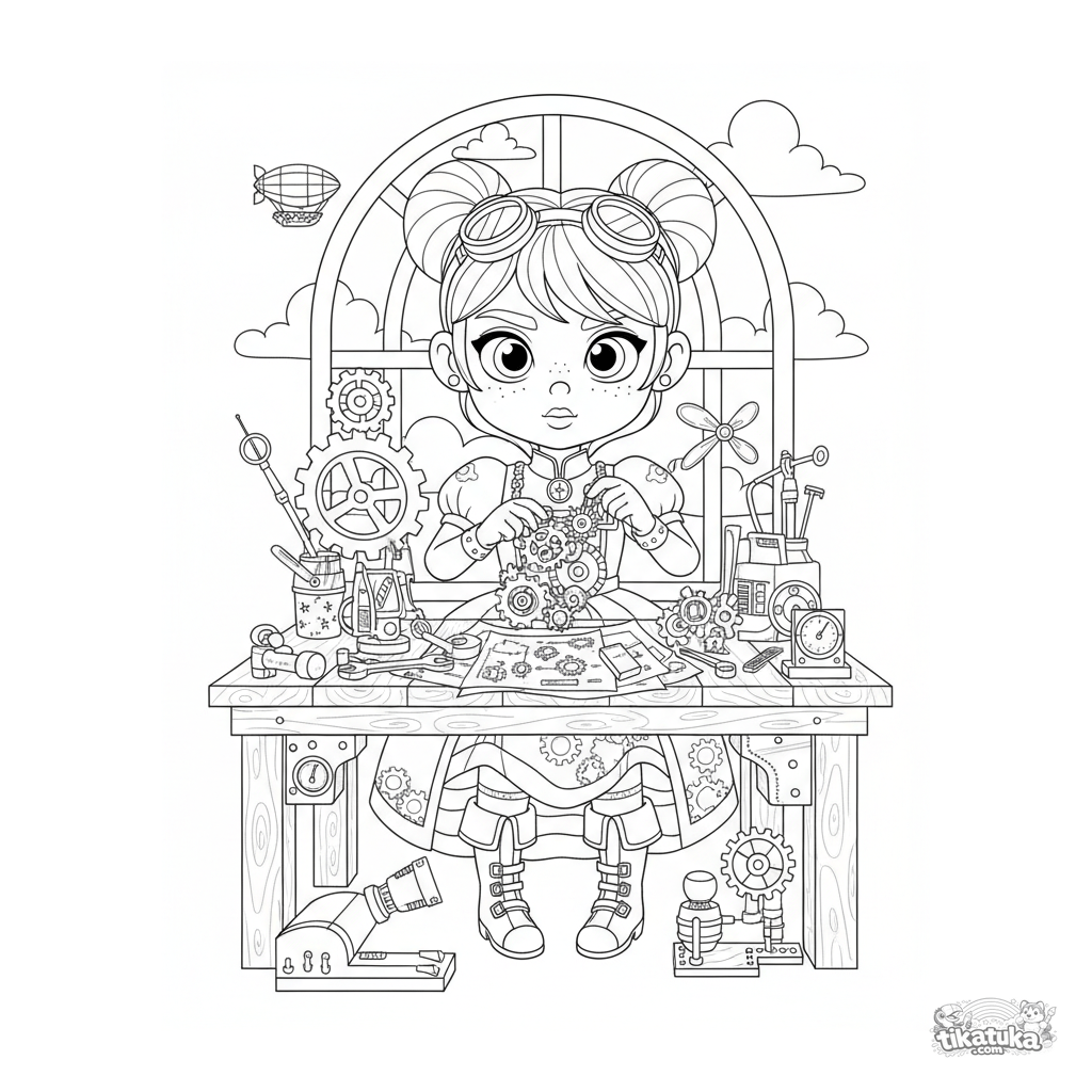 Ausmalbild für ältere Kinder 10-12: Eine Steampunk-Prinzessin bastelt an einem Zahnradgetriebe in ihrer schwebenden Werkstatt.