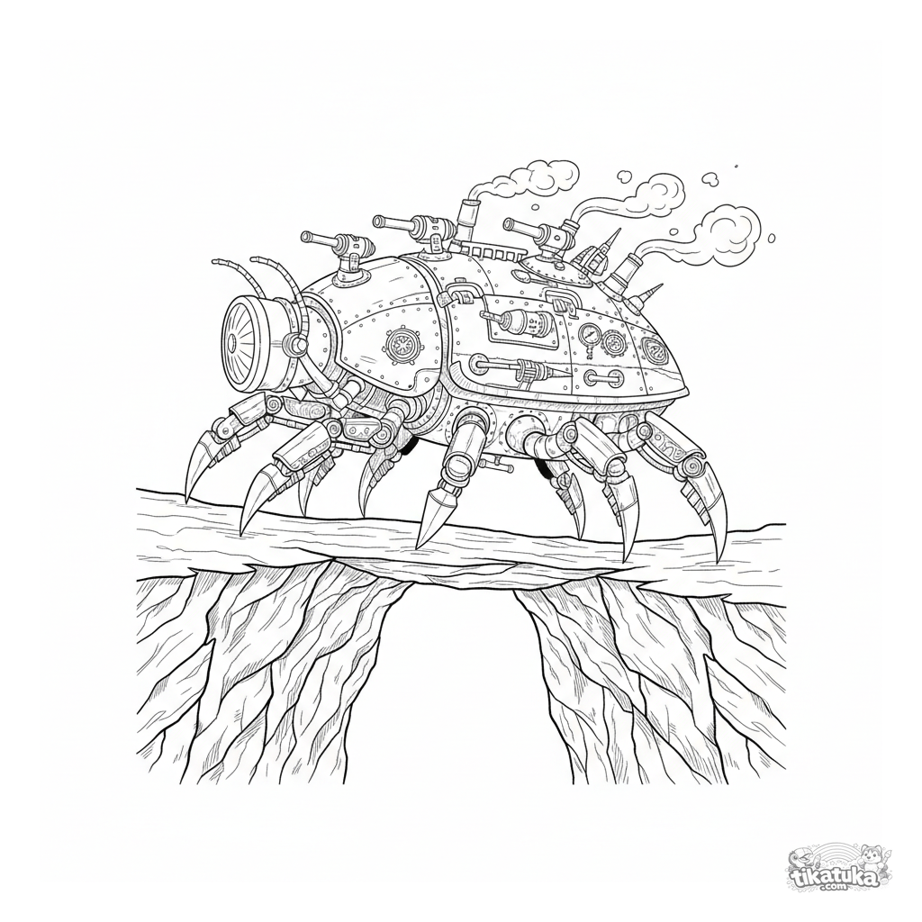 Schwieriges Ausmalbild für ältere Kinder 7-12: ein detaillierter Steampunk-Panzer mit Kolbenbeinen überquert eine felsige Schlucht. Hoher Detaillierungsgrad der Mechanik.
