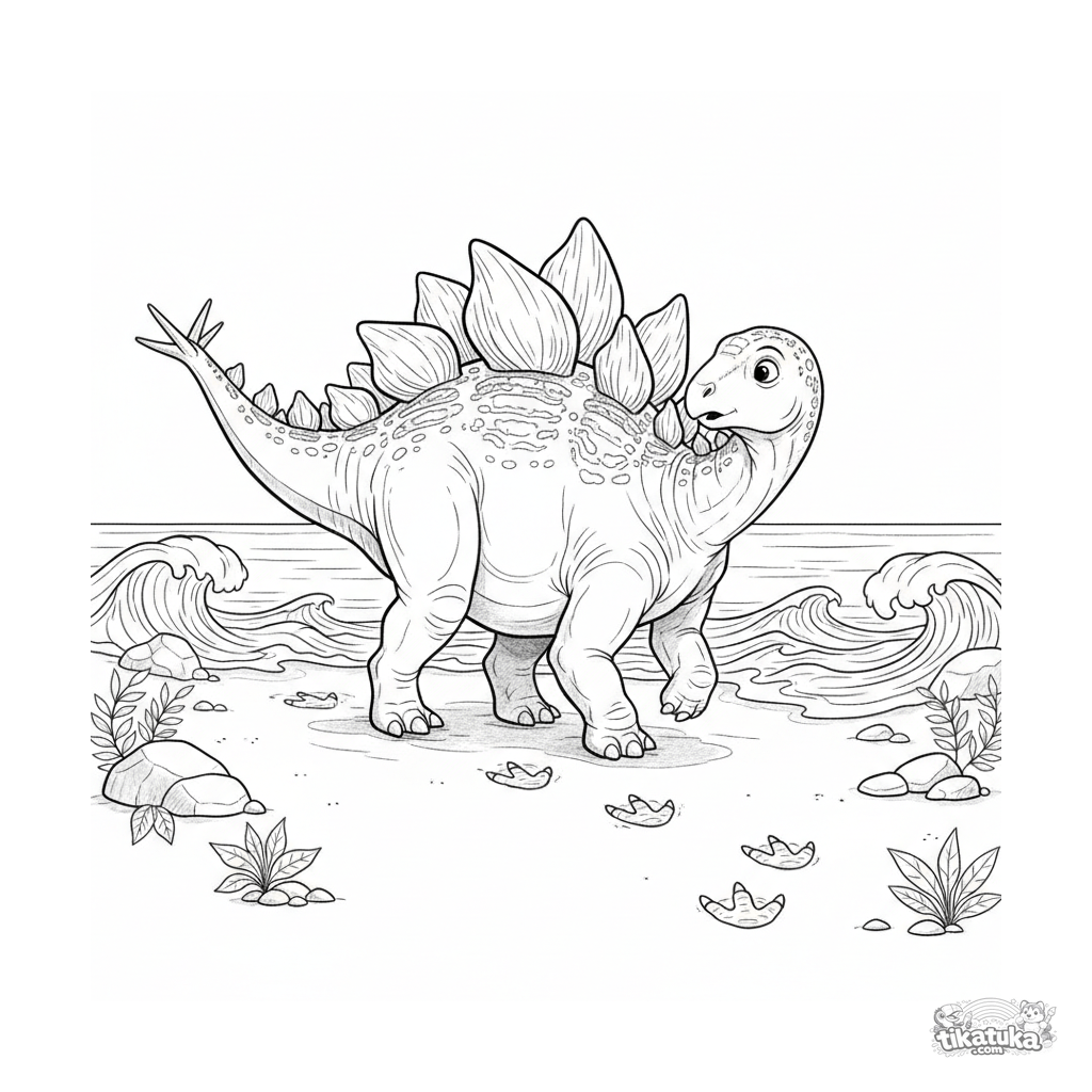 Detailliertes Ausmalbild im Aquarell-Skizzenstil für Kinder 10-12: Ein Stegosaurus hinterlässt Fußabdrücke im nassen Sand eines uralten Ozeans.