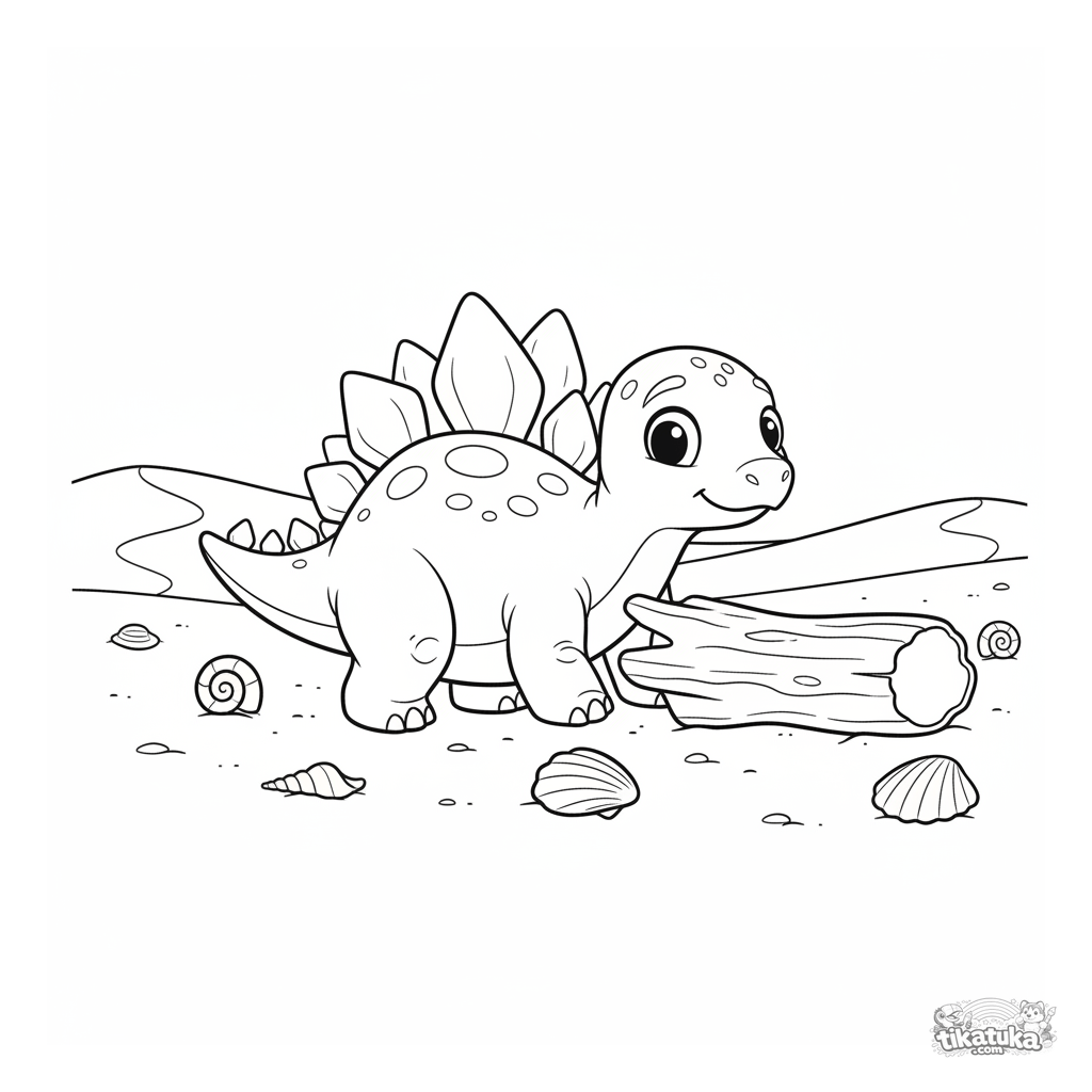 Ausmalbild für Kinder von 7-9 Jahren: Ein verspielter Stegosaurus stößt ein Stück Treibholz am Sandstrand des urzeitlichen Ozeans an.