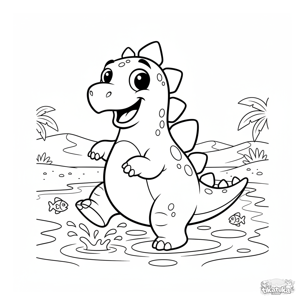 Ausmalbild für 7-9 Jahre: ein fröhlicher Stegosaurus plantscht im flachen Wasser eines uralten Ozeans.