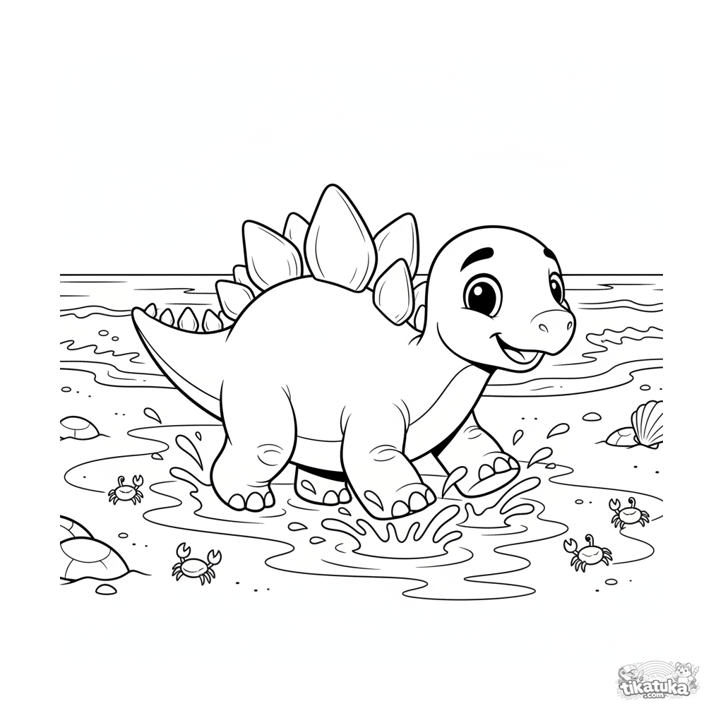 Ausmalbild für 7-9 Jahre: ein junger Stegosaurus tollt fröhlich in Gezeitentümpeln am sandigen Strand eines uralten Ozeans.