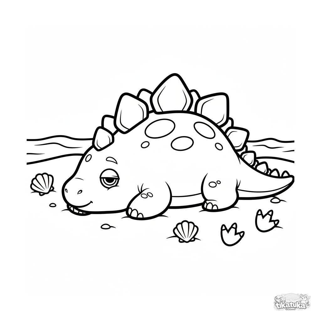 Einfaches Ausmalbild für Kleinkinder 2-3: Ein niedlicher Stegosaurus ruht auf einer Sanddüne am uralten Ozean. Große Formen, dicke Umrisse.