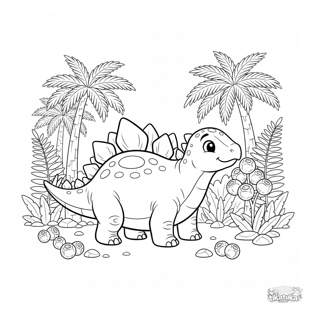 Ausmalbild für Kinder 4-6: ein freundlicher Stegosaurus mit gemusterten Platten steht in einem prähistorischen Hain aus Farnen und Palmfarnen.